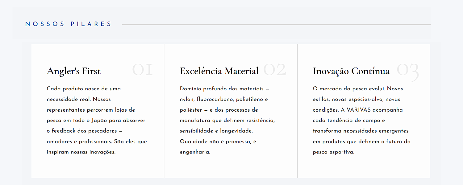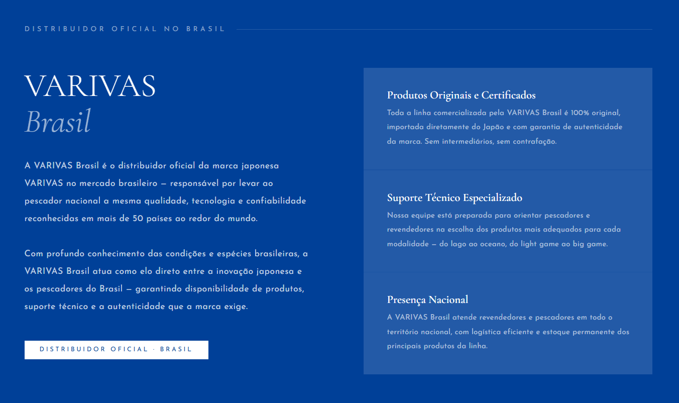 Fundada no Japão, a VARIVAS emergiu como a primeira linha de pesca certificada IGFA fabricada em território japonês — um marco que redefiniu os padrões globais da pesca esportiva. Por mais de 40 anos, guiada pela filosofia "Angler's First", a marca combina pesquisa de materiais de ponta com escuta ativa dos pescadores no campo. Hoje, nossos produtos chegam a mais de 50 países, levando a pescadores do mundo inteiro a confiança que só a excelência japonesa pode oferecer.